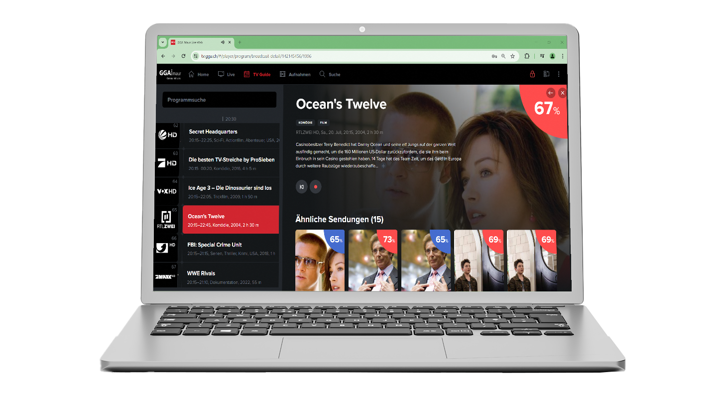 Bei uns sind Sie flexibel: Mit der GGA TV-Box, direkt auf Ihrem Smart TV, über Apple TV oder Android TV, im Browser oder unterwegs auf dem Smartphone.