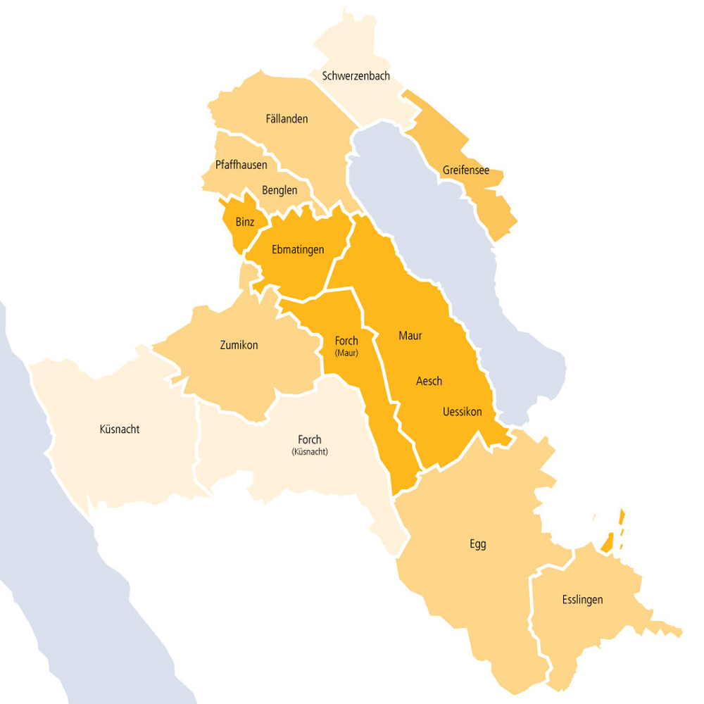 Aesch, Benglen, Binz, Ebmatingen, Egg, Esslingen, Fällanden, Forch, Greifensee, Küsnacht, Maur, Pfaffhausen, Schwerzenbach, Uessikon, Zumikon und Teile von Mönchaltorf.